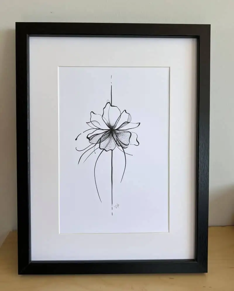 Fleur Délicatesse est un dessin minimaliste au feutre noir, imprimé à partir de mon œuvre originale. À travers un trait fin et épuré, je mets en lumière la délicatesse de la fleur et la poésie du geste.