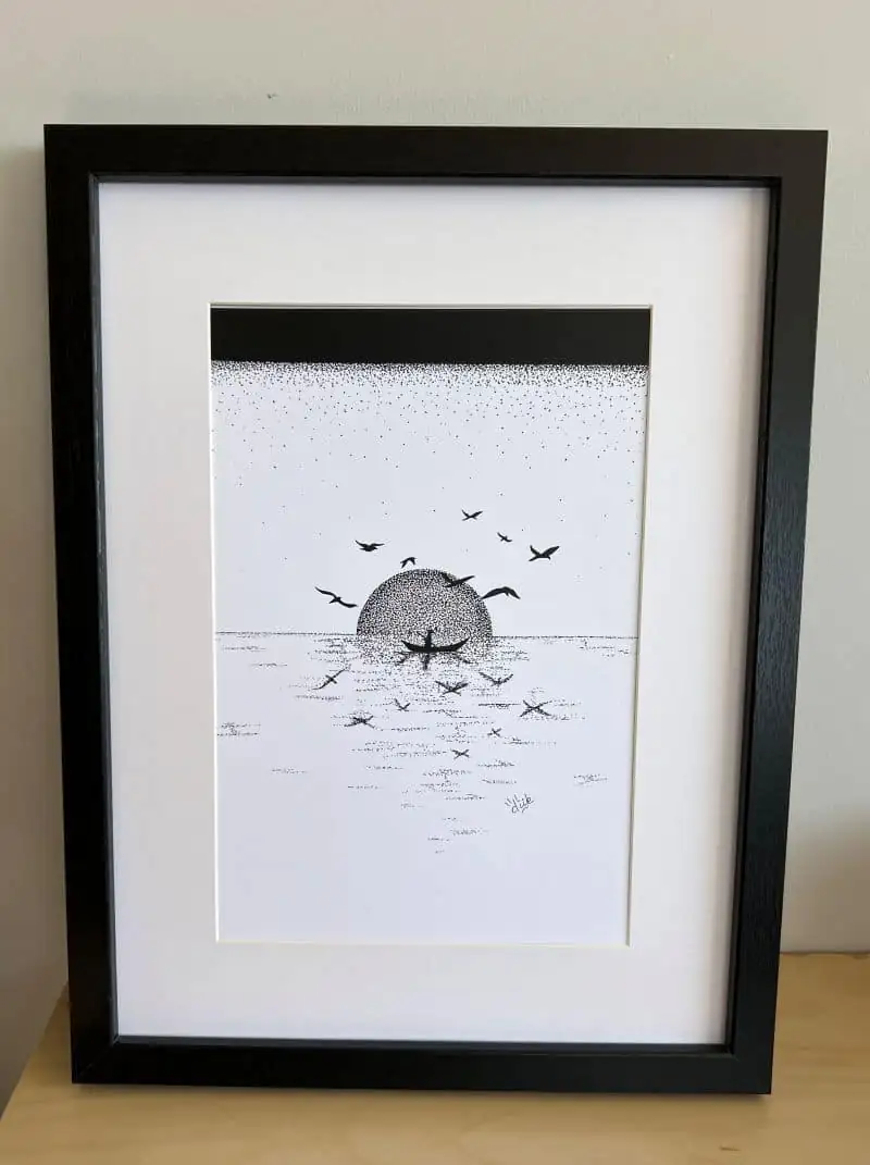 “L’ombre du pêcheur” – Dessin en pointillisme au feutre noir