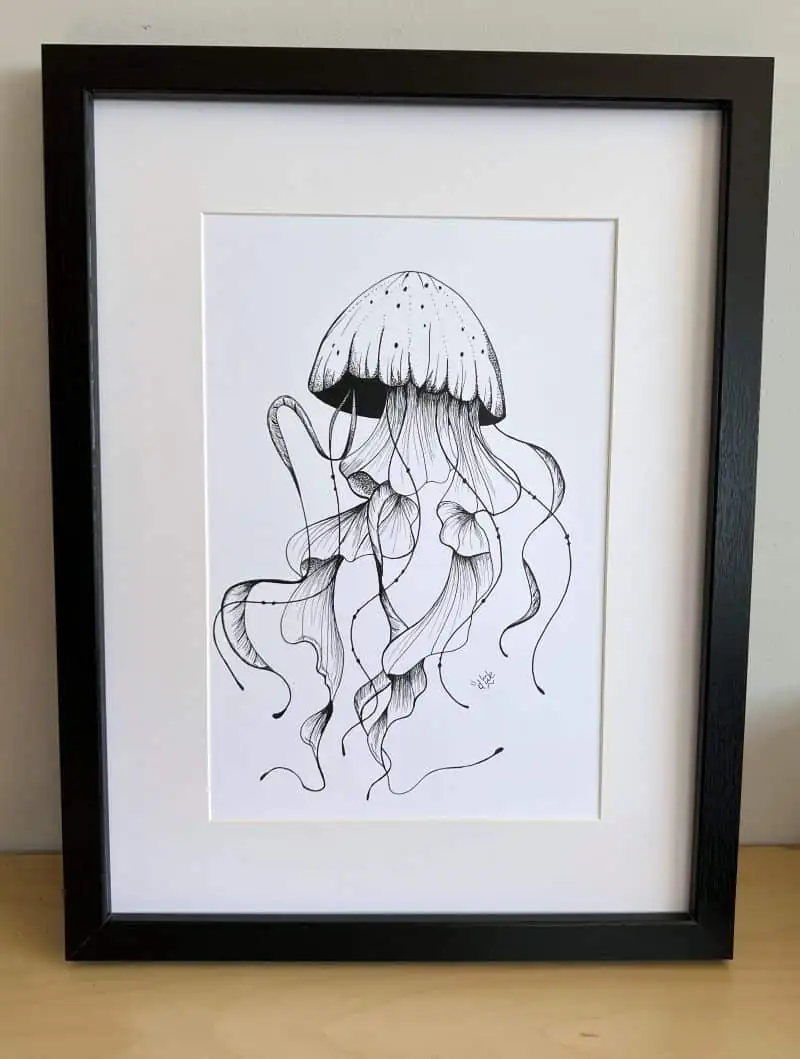 Méduse est un dessin au feutre noir inspiré du monde marin, réalisé et imprimé à partir de l’original. J’y explore la grâce fluide de la méduse, symbole de légèreté et de mouvement, à travers un trait minimaliste et précis.