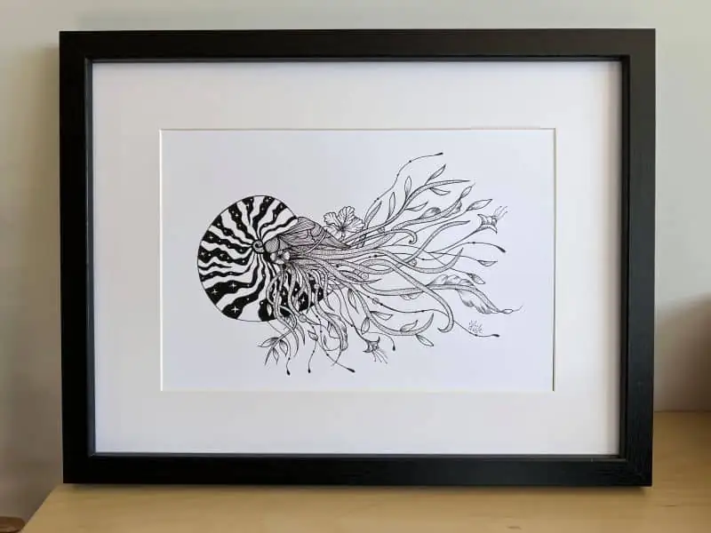 Plongez dans la beauté géométrique des fonds marins avec “Nautile”, un dessin au feutre noir signé Muriel Dhouailly – D’île en île.