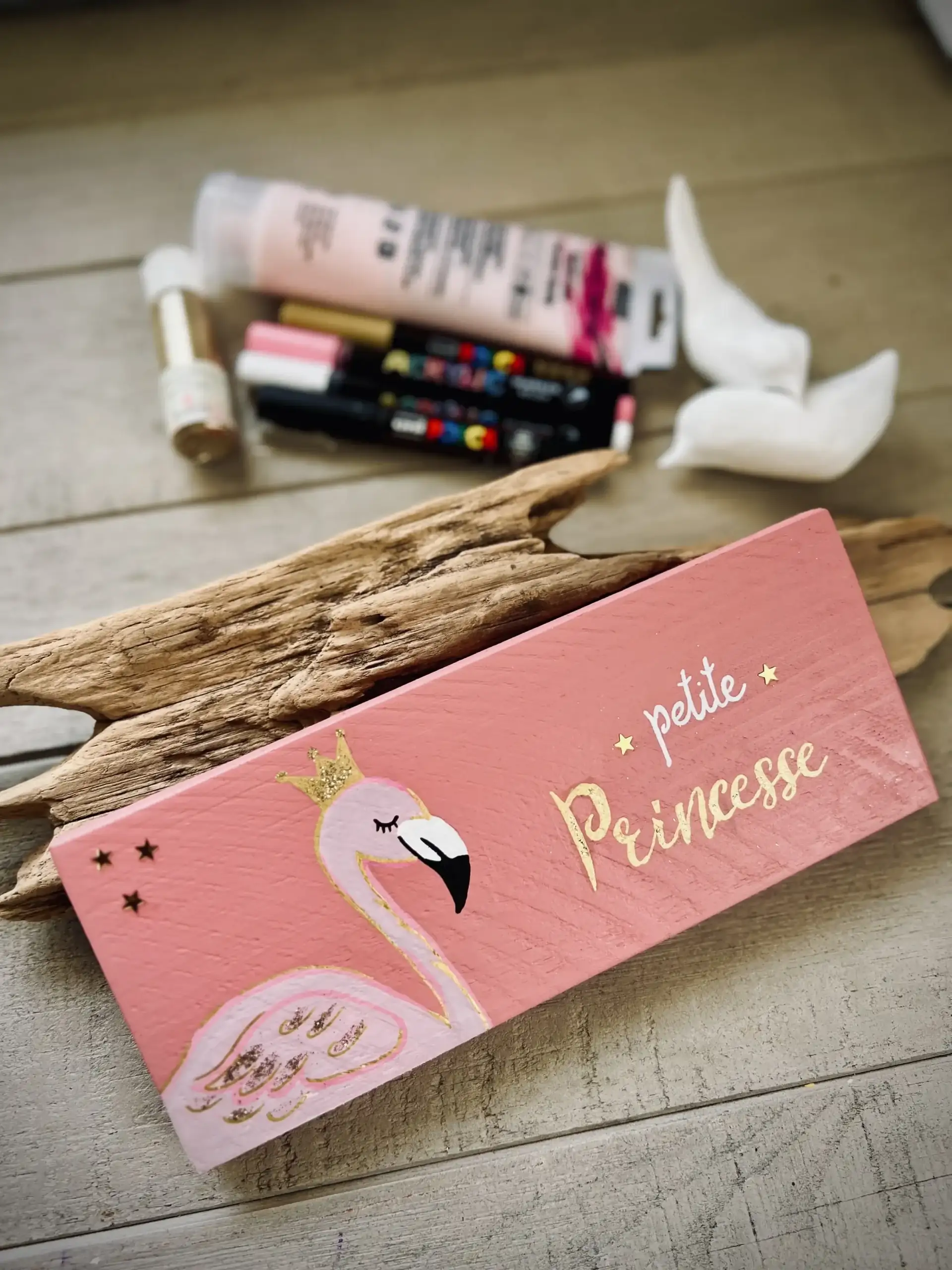 Ce panneau en bois upcyclé peint à la main est une création douce et poétique. Le fond rose met en valeur un flamant rose couronné, dessiné à la main comme symbole de grâce et de confiance. L’inscription Petite Princesse, réalisée en doré pailleté, apporte une touche lumineuse et délicate.