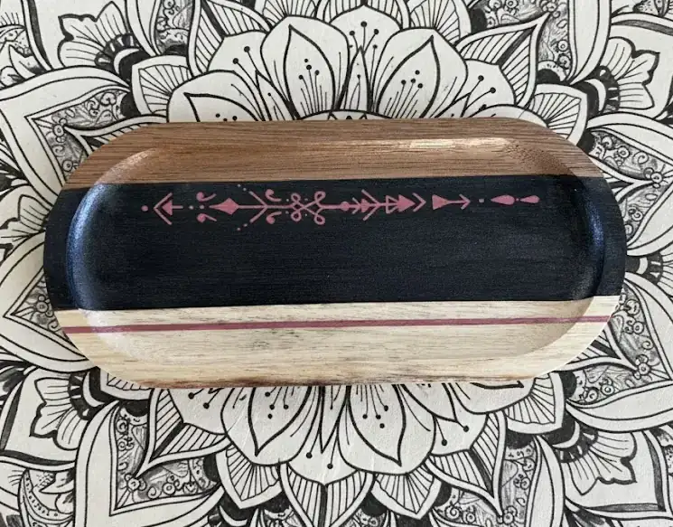 Au centre de cette coupelle décorative, le pictogramme graphique évoque la force, la liberté et la connexion à la nature. Je travaille le dessin comme un signe intemporel, posé sur la matière vivante du bois. Le bois d’acacia naturel, avec ses veines et ses nuances, dialogue avec la peinture pour créer un équilibre entre authenticité et modernité.