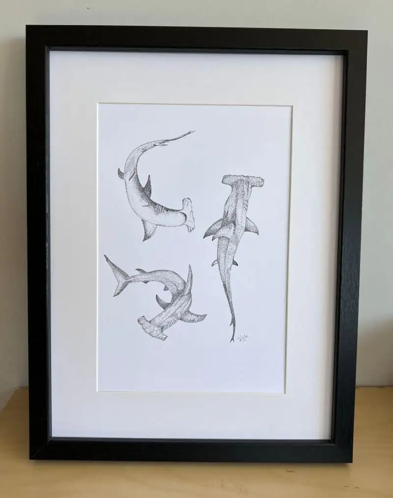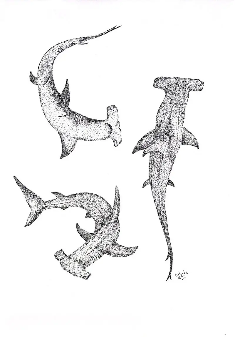 Avec Trio de Marteaux, je vous invite à plonger dans l’univers profond et graphique de l’océan. Ce dessin en pointillisme au feutre noir représente trois requins-marteaux, silhouettes puissantes et élégantes, évoluant dans un équilibre silencieux. Le requin-marteau est pour moi un symbole de force, de mystère et d’harmonie marine, une présence à la fois imposante et fascinante.